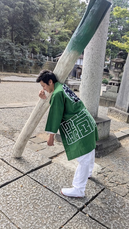大きな深谷ねぎを担ぐ委員長が瀧宮に参拝し奉納するイメージで作りました。